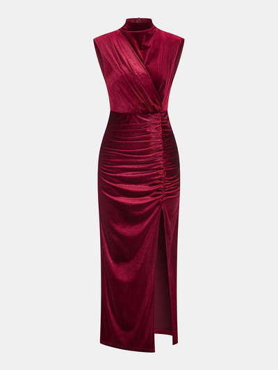Sleeveless Side Slit Velvet Mock Neck Maxi Dress