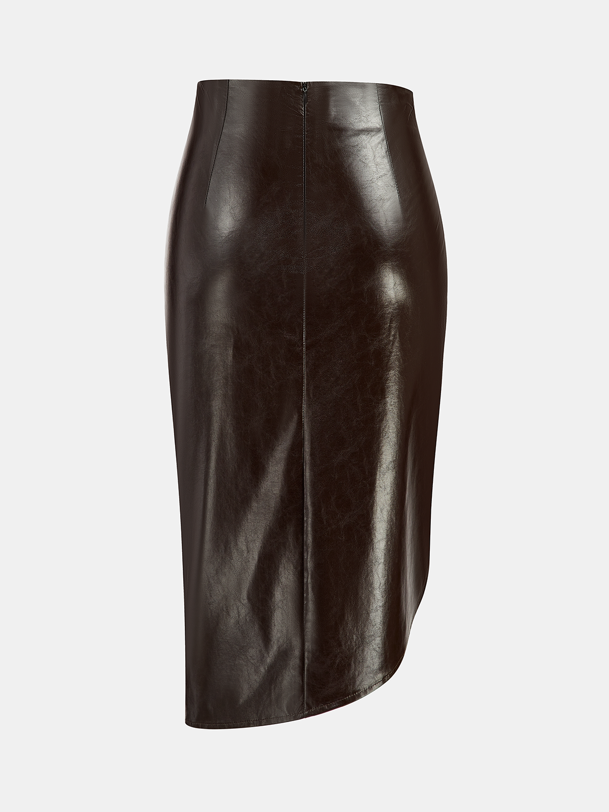 Asymmetric Ruched Slit Faux Leather Midi Skirt