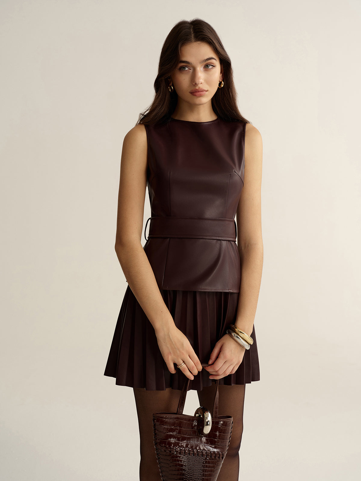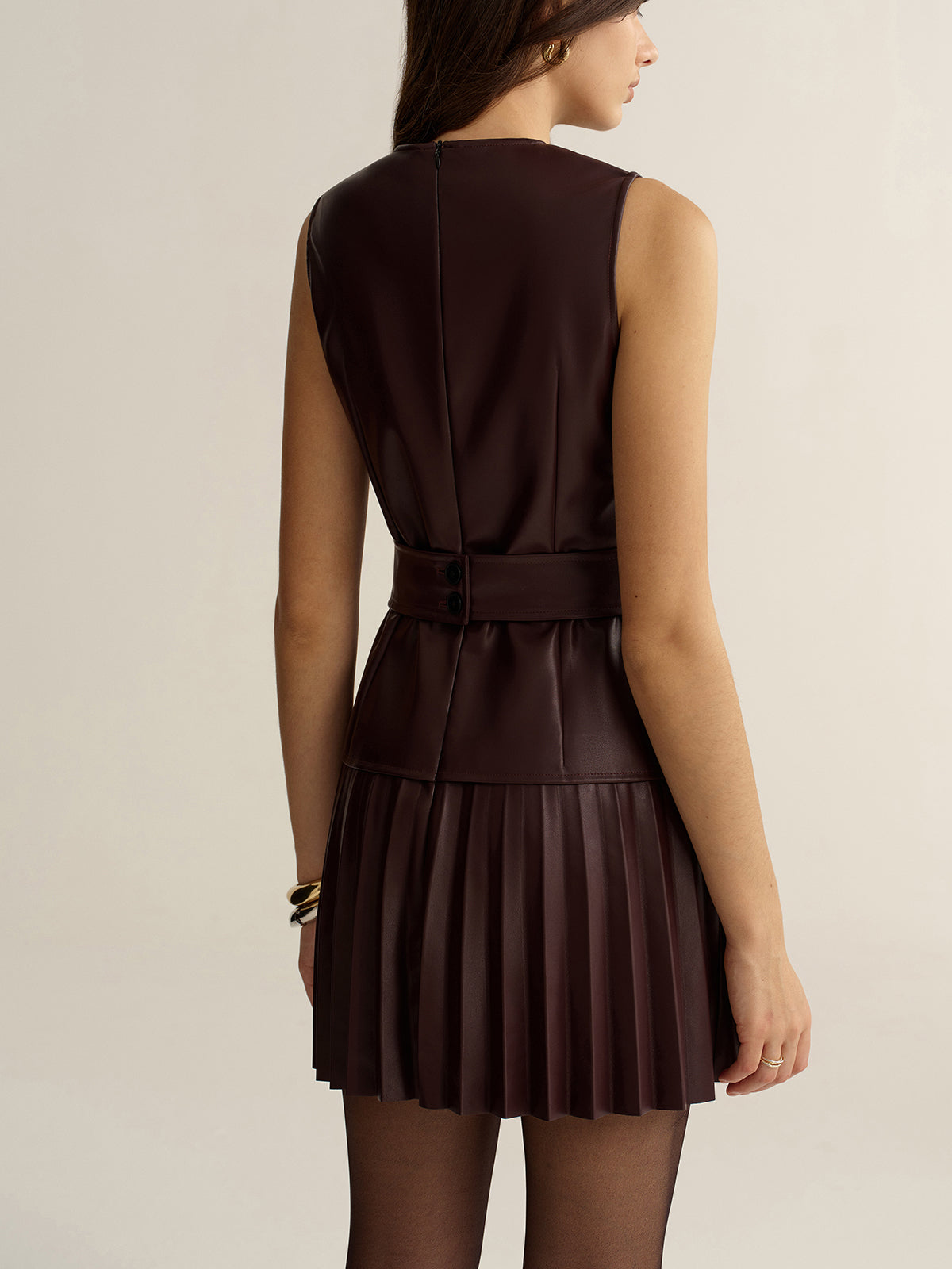 Belted Faux Leather Sleeveless Pleated Mini Dress