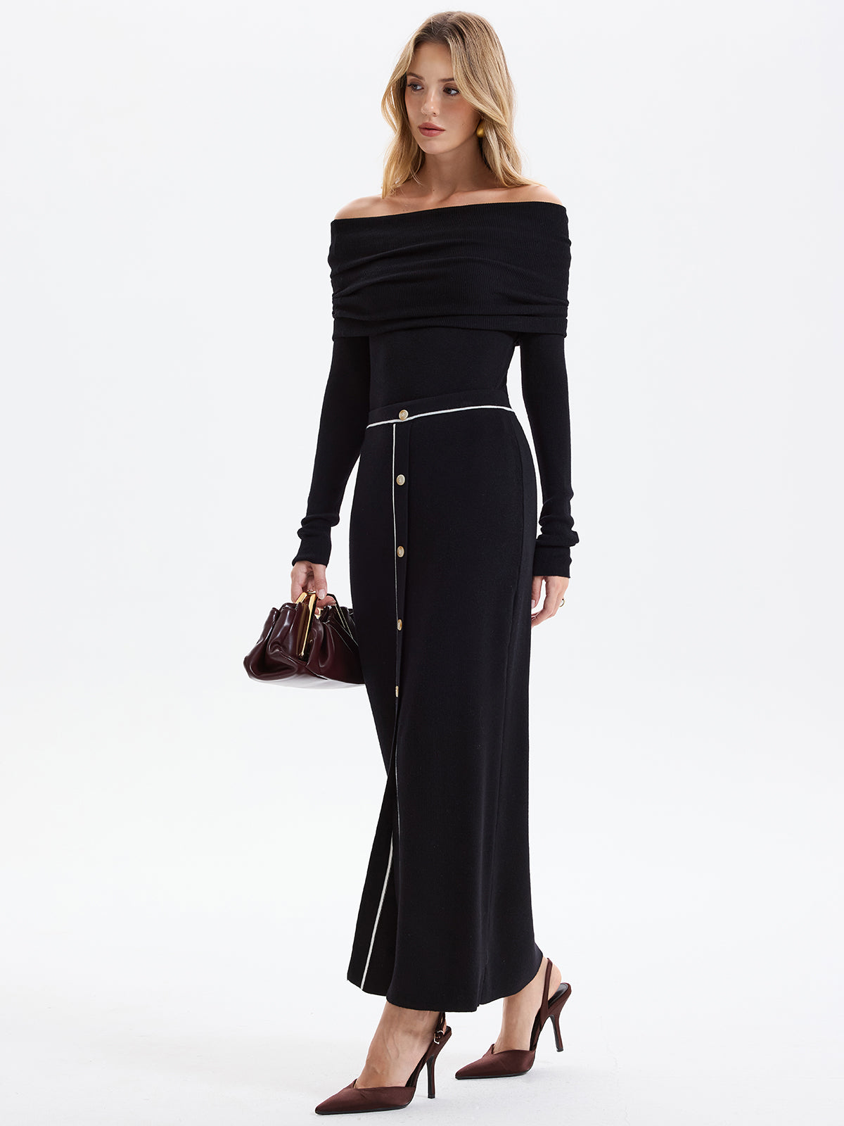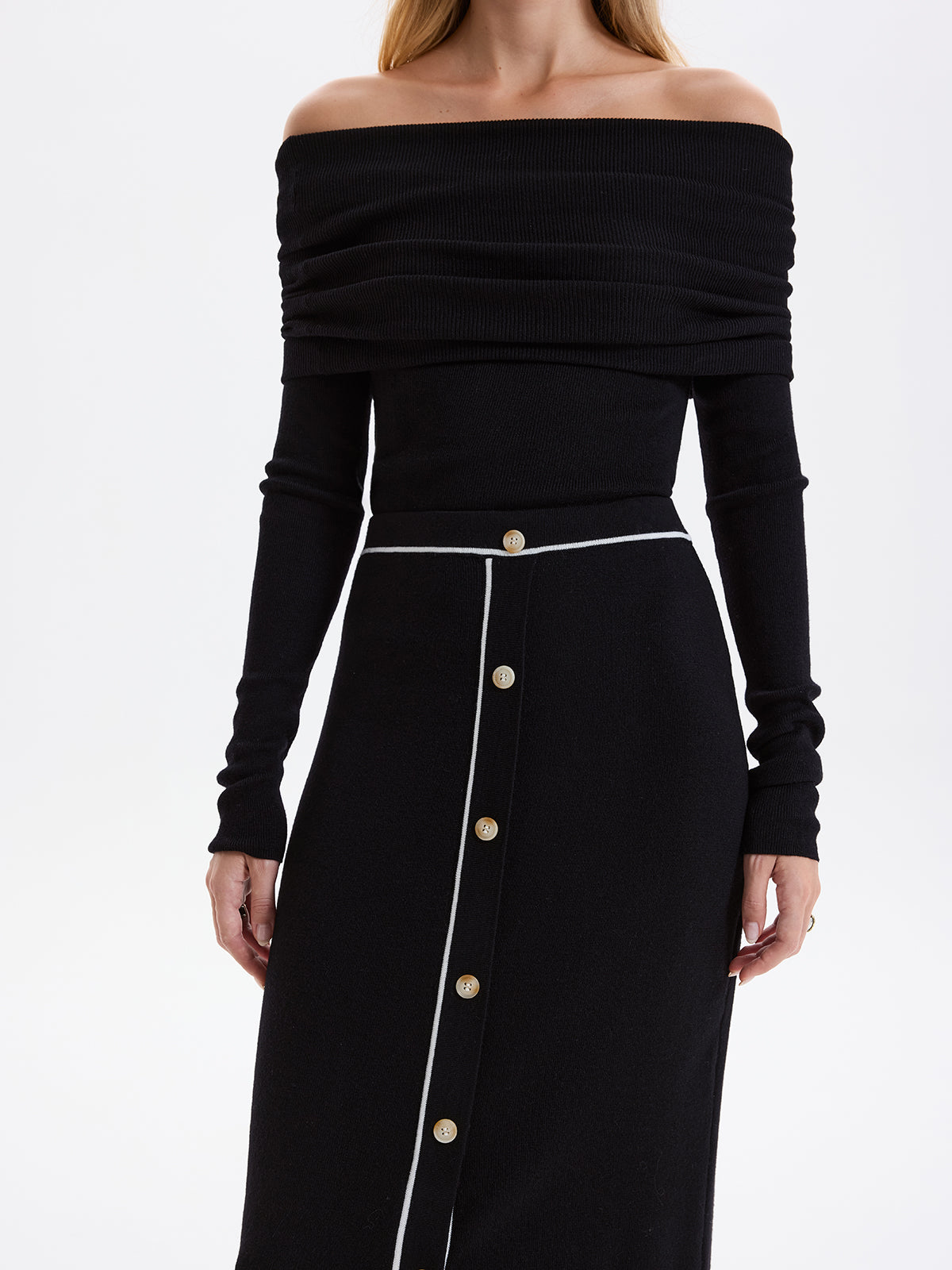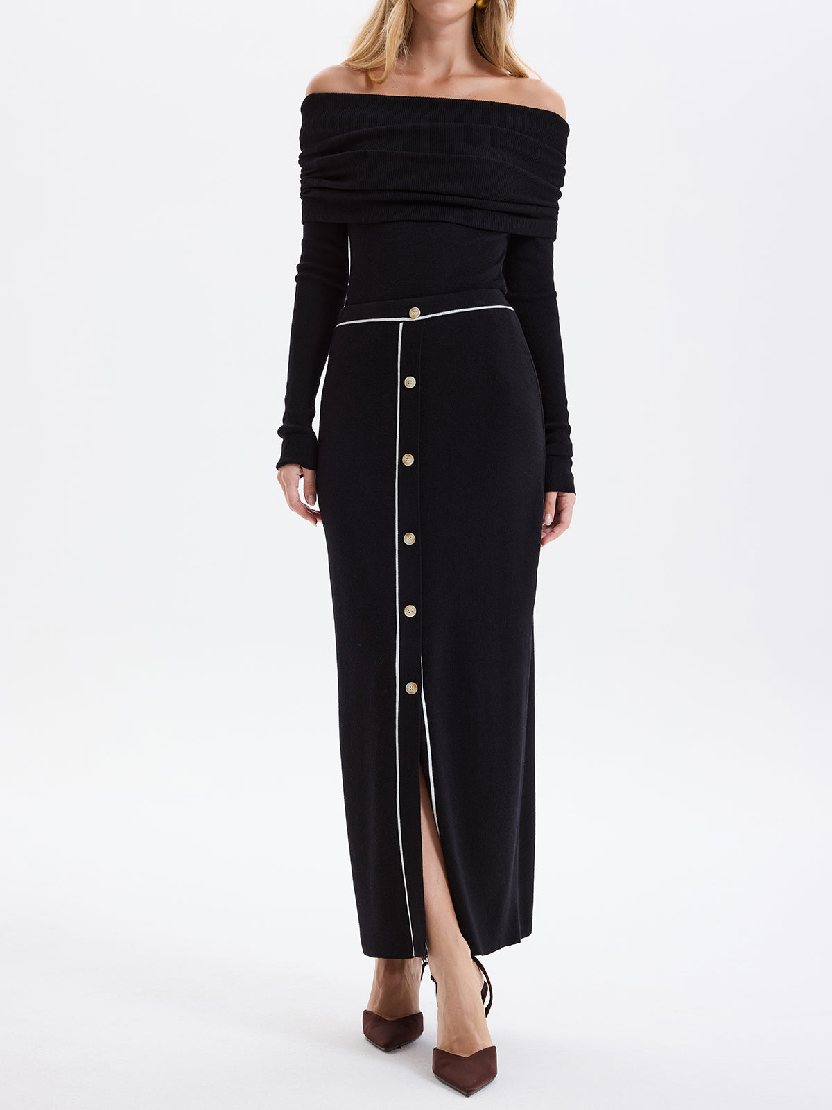 Contrast-Trim Button-Front Maxi Knit Skirt