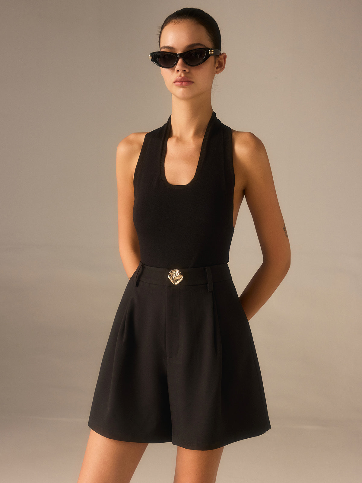 black,bottoms,clothing,coll:bottoms,coll:shorts,coll:vacation,coll:weekend_getaway,corpcore,daily,fall,in_six_month,inner sample,metal detail,mid waist,no,non-stretch,not_low_sales,oa250514033,occasion,photo_model,regular,shift,short pants,shorts,spring,summer,vacation,women,woven fabric