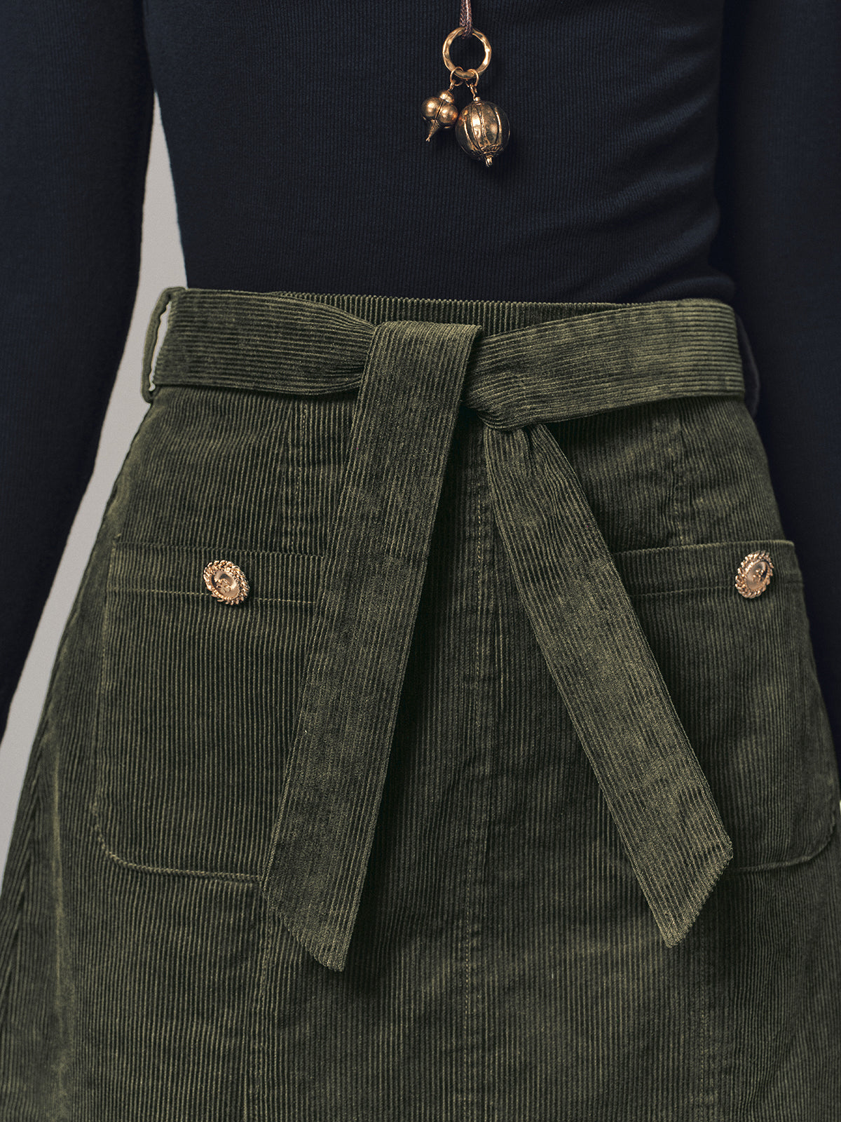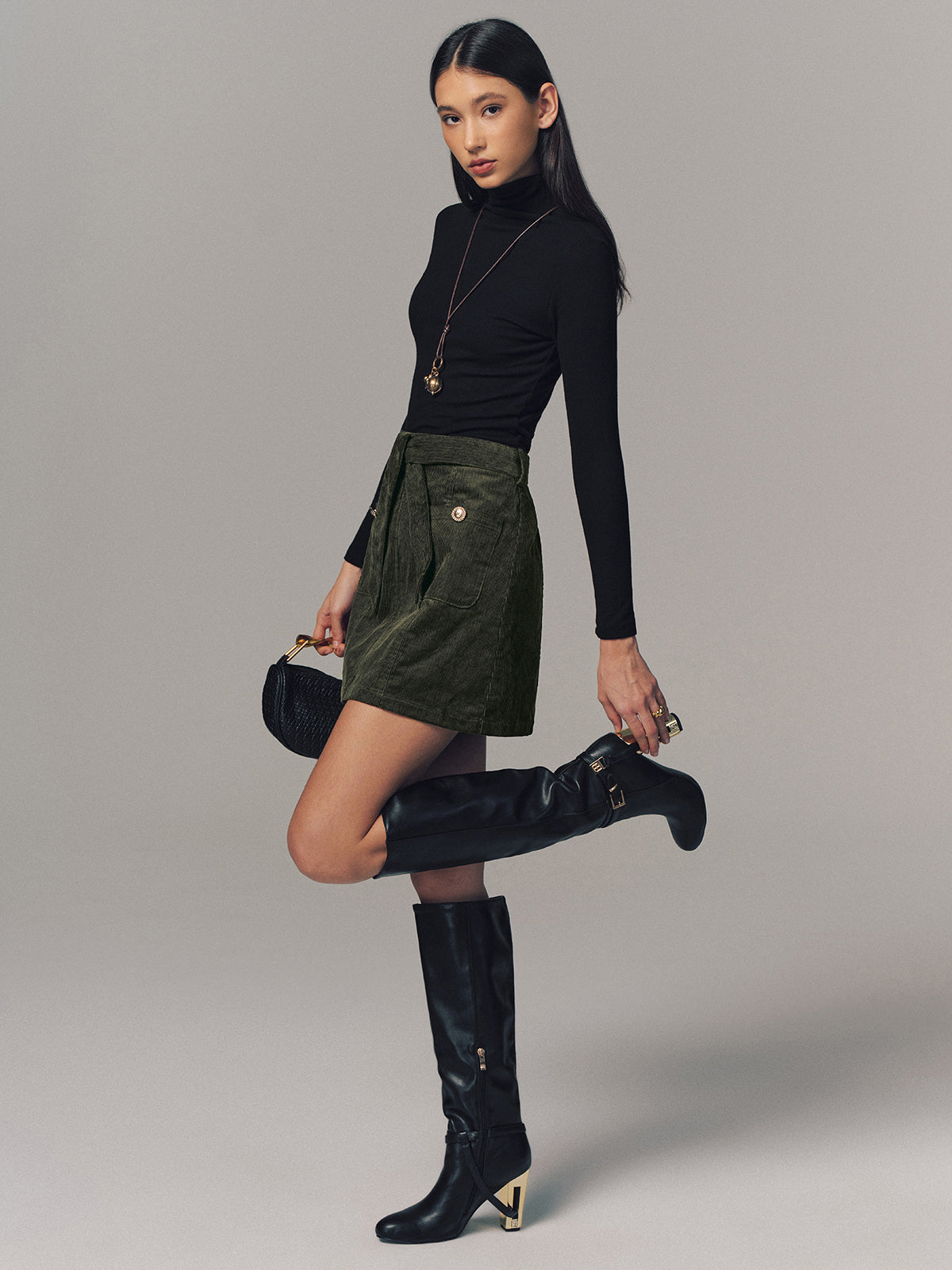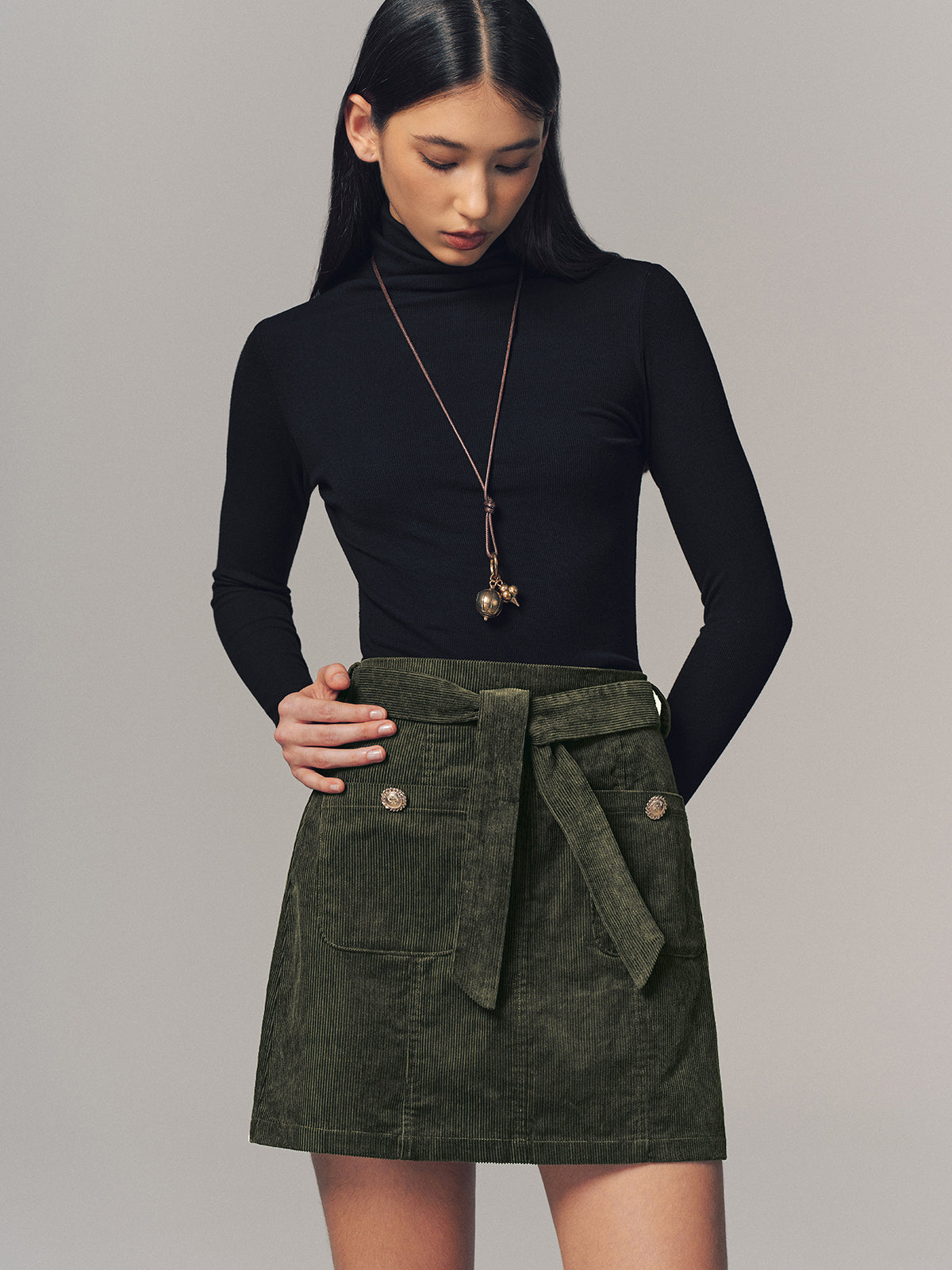 belted,bottoms,casual,clothing,coll:bottoms,coll:skirts,corduroy,dark green,date,fall,in_six_month,metal detail,mid waist,minegence,no,non-stretch,not_low_sales,oa251027088,photo_model,regular,regular fit,short,skirts,winter,women