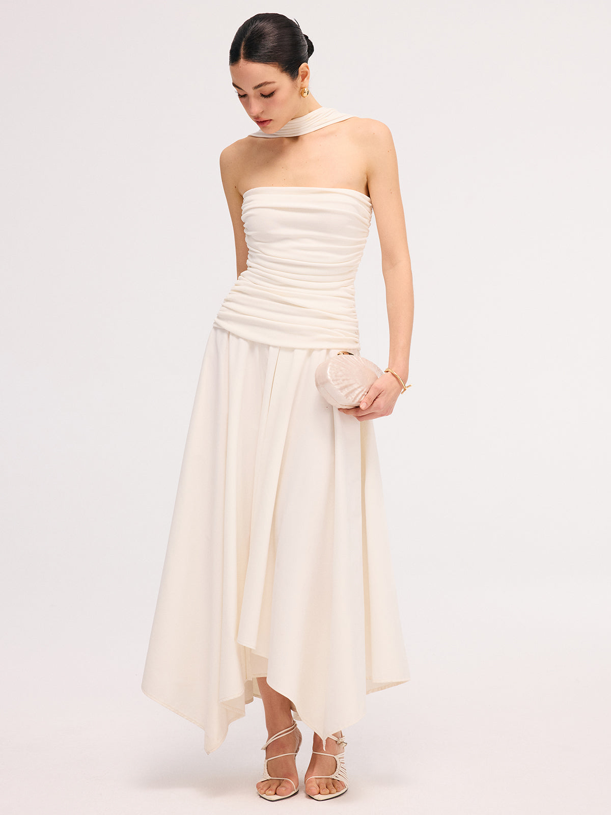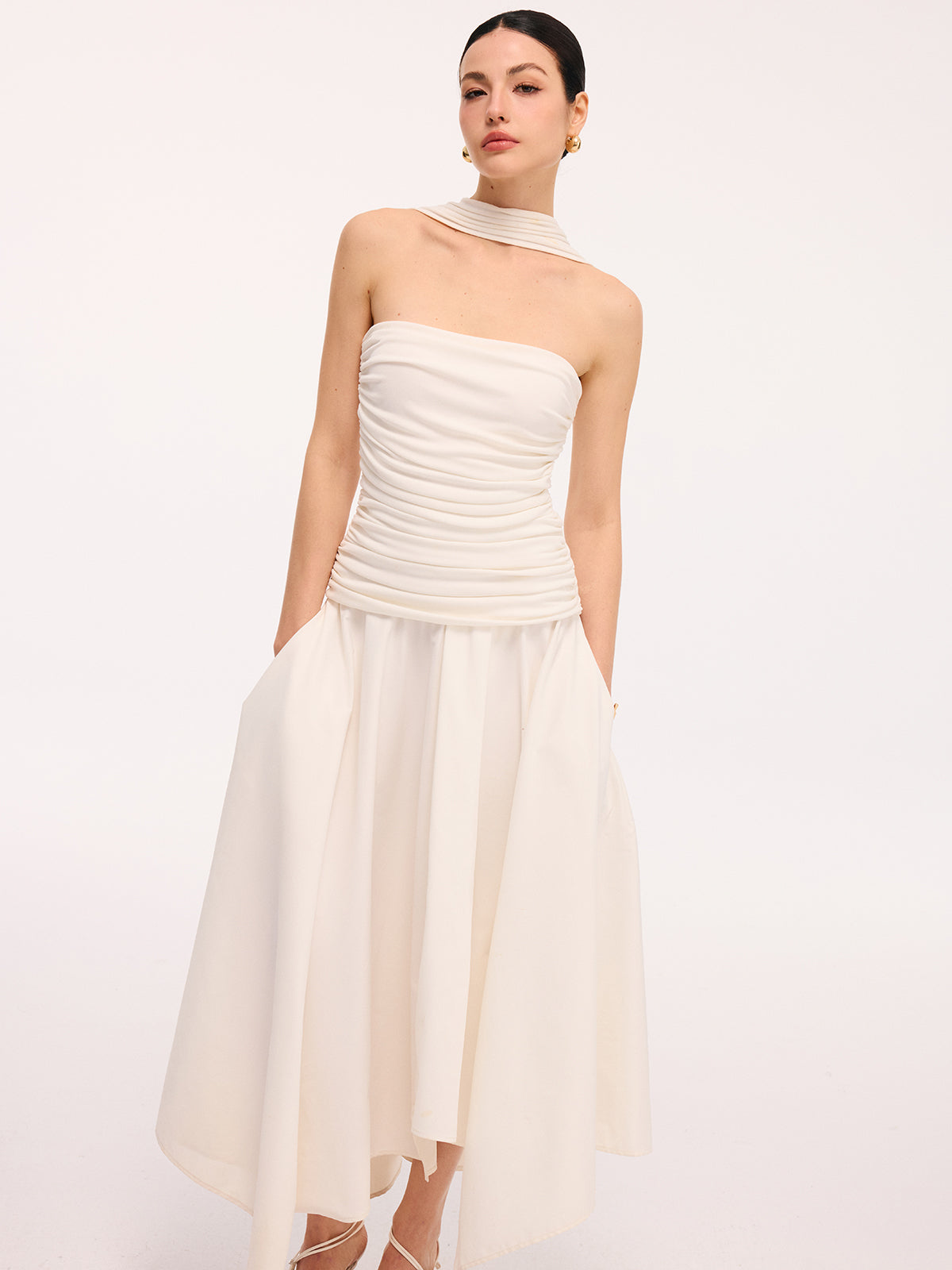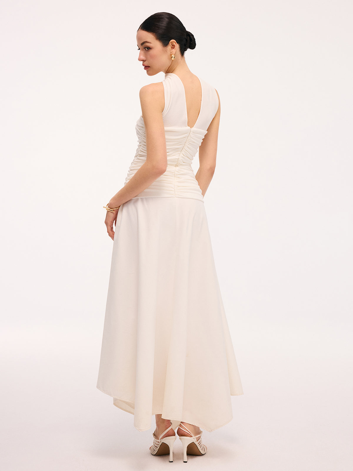 clothing,coll:dresses,coll:night_glam,collarless,date,dresses,feminine,halter,in_six_month,invisible zipper,jersey,midi,no,not_low_sales,oa251219004,party,photo_model,regular,regular fit,ruched,season of love,sleeveless,slight stretch,white,women,woven fabric