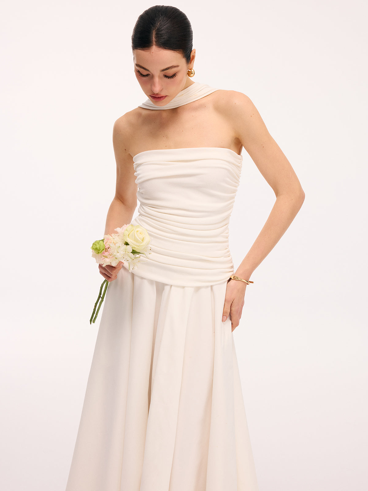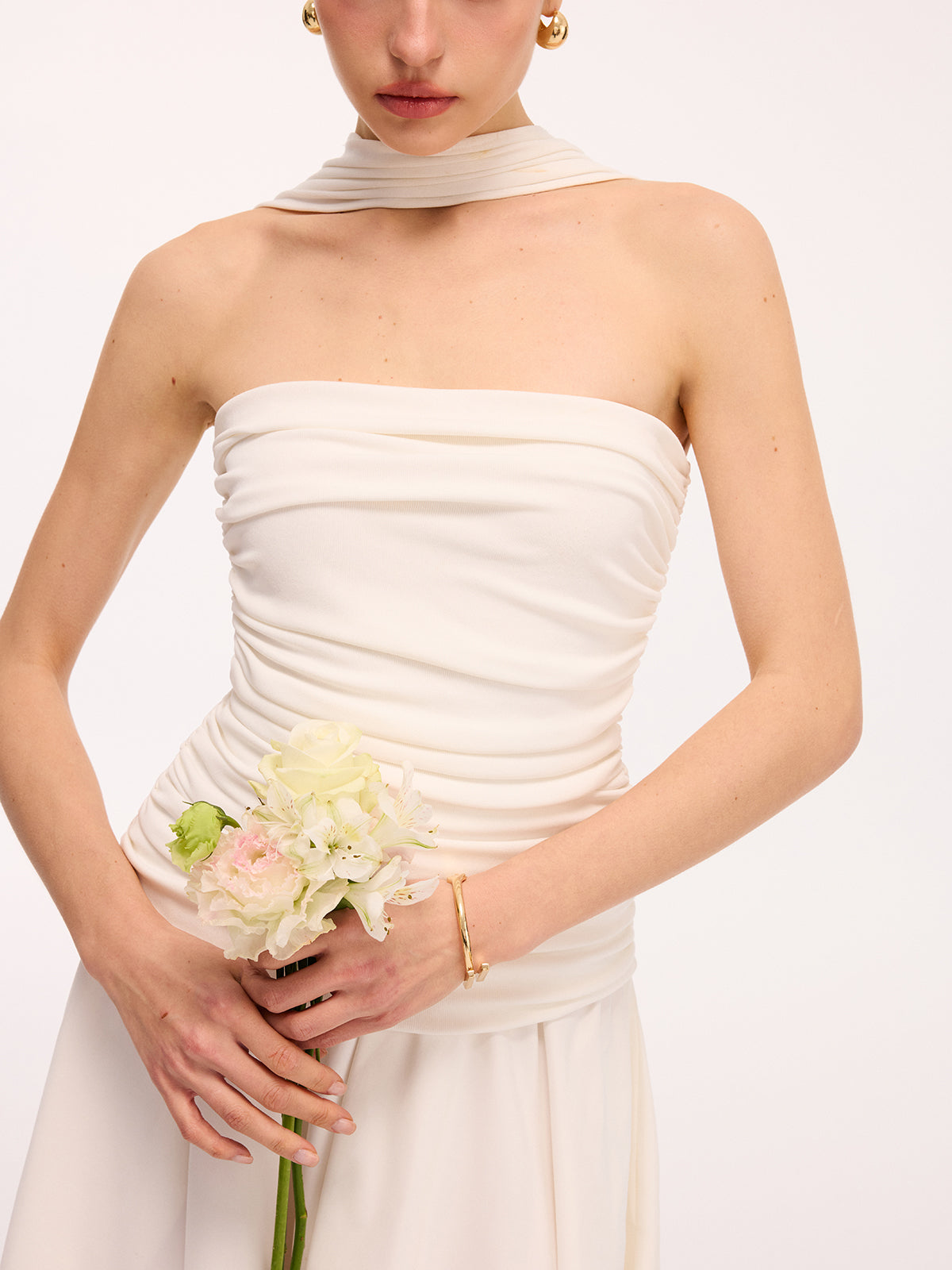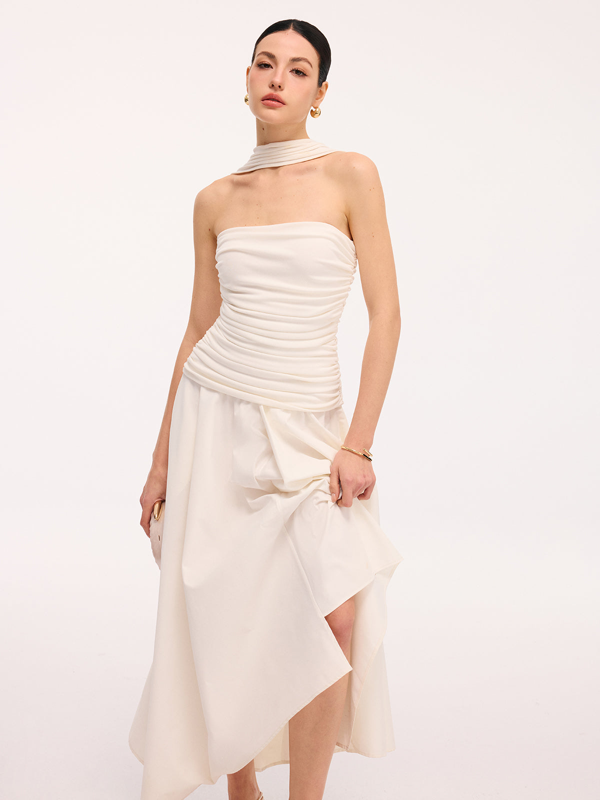 clothing,coll:dresses,coll:night_glam,collarless,date,dresses,feminine,halter,in_six_month,invisible zipper,jersey,midi,no,not_low_sales,oa251219004,party,photo_model,regular,regular fit,ruched,season of love,sleeveless,slight stretch,white,women,woven fabric