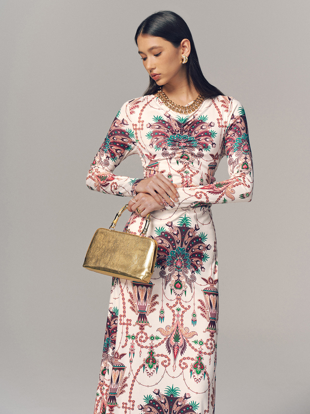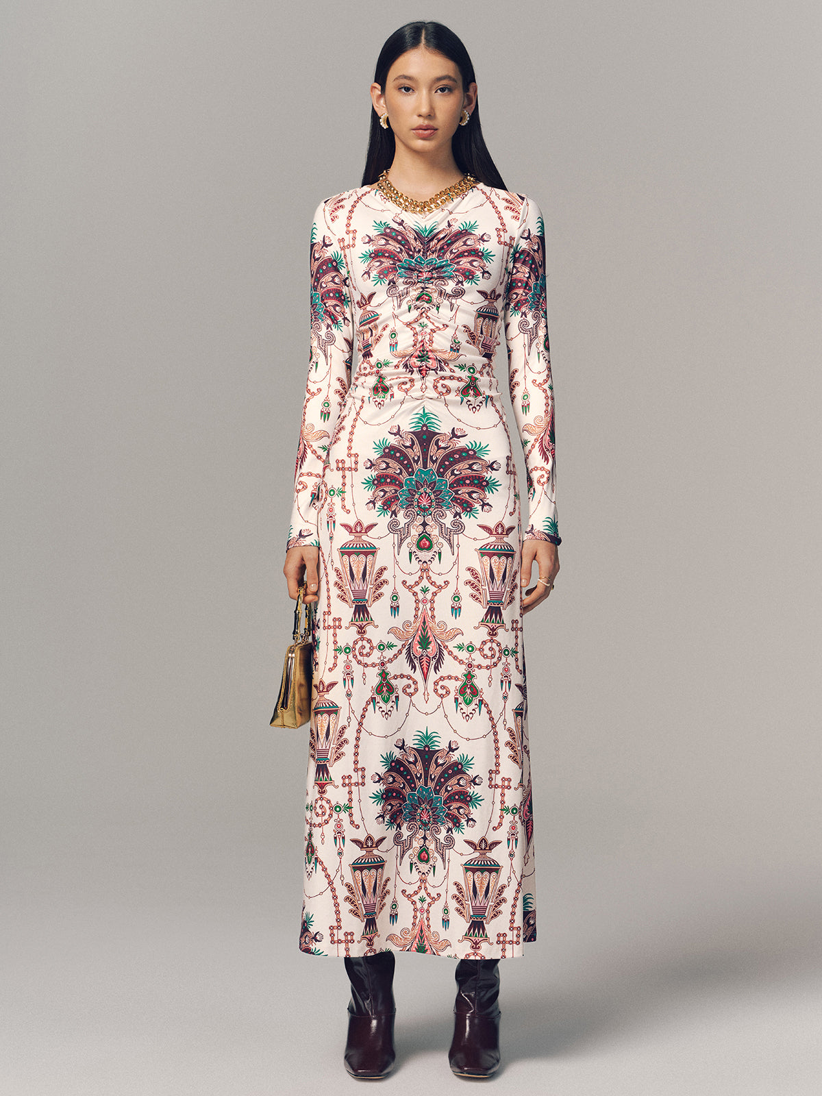 Ruched Printed Long-Sleeve Maxi Dress