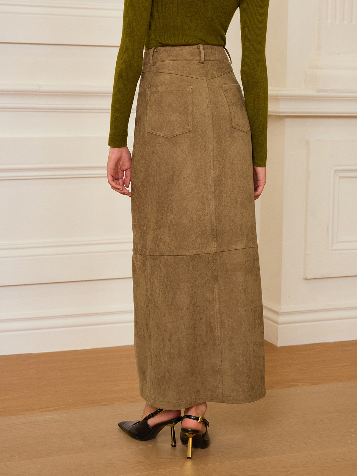 basic - fabric,bottoms,casual,clothing,coll-2025-10-20,coll:bottoms,coll:night_glam,coll:skirts,coll:trending,coll:vintage_fabrics,elevated winter closet,fall,in_six_month,inner sample,invisible zipper,khaki,maxi,mid waist,minegence,no,non-stretch,not_low_sales,oa250807067,party,photo_model,regular,regular fit,skirts,suede,winter,women