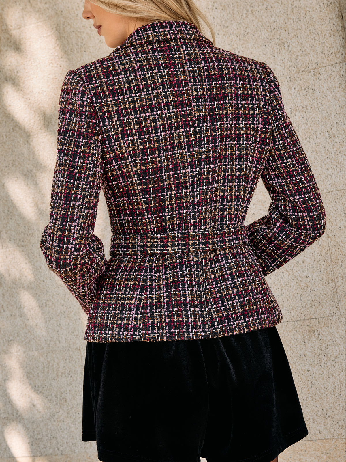 blazers,casual,clothing,coll:blazers,coll:outerwear,coll:plaids_polka,coll:tops,coll:trending,coll:vintage_fabrics,corpcore,fall,feminine,in_six_month,long sleeve,multicolor,non-stretch,not_low_sales,oa251029038,outerwear,photo_model,plaid,regular,regular fit,spring,tweed,winter,winter hues,women