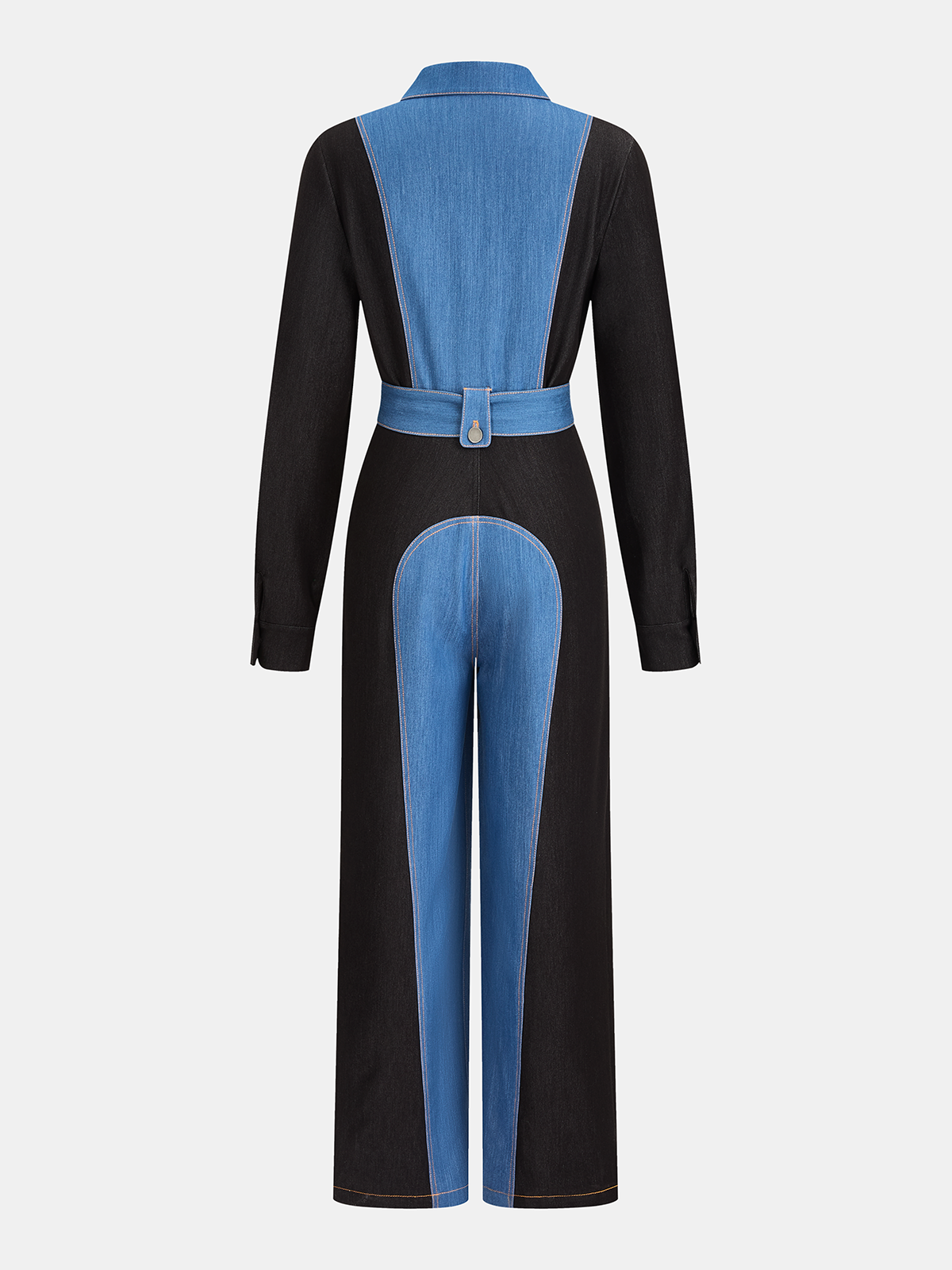 Belted Zipper Front Two-Tone Denim Jumpsuit