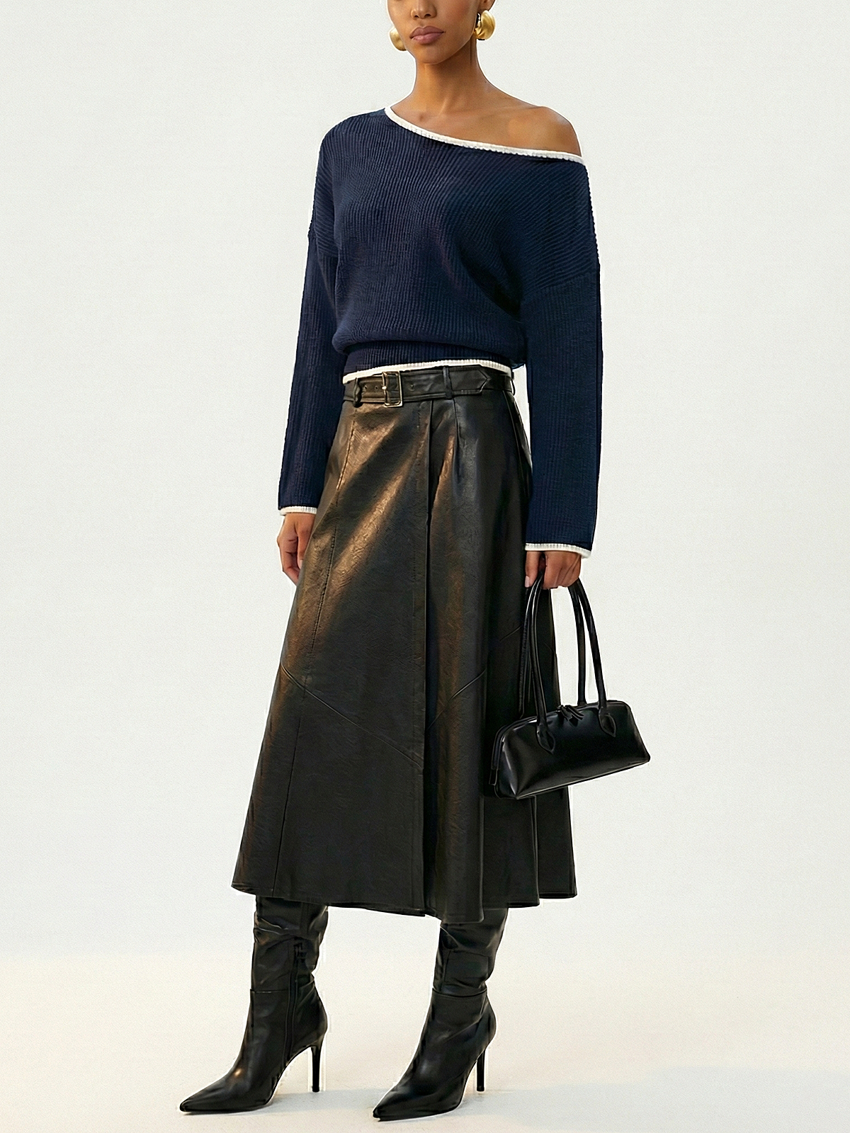 Contrast Trim Ribbed Off-Shoulder Sweater