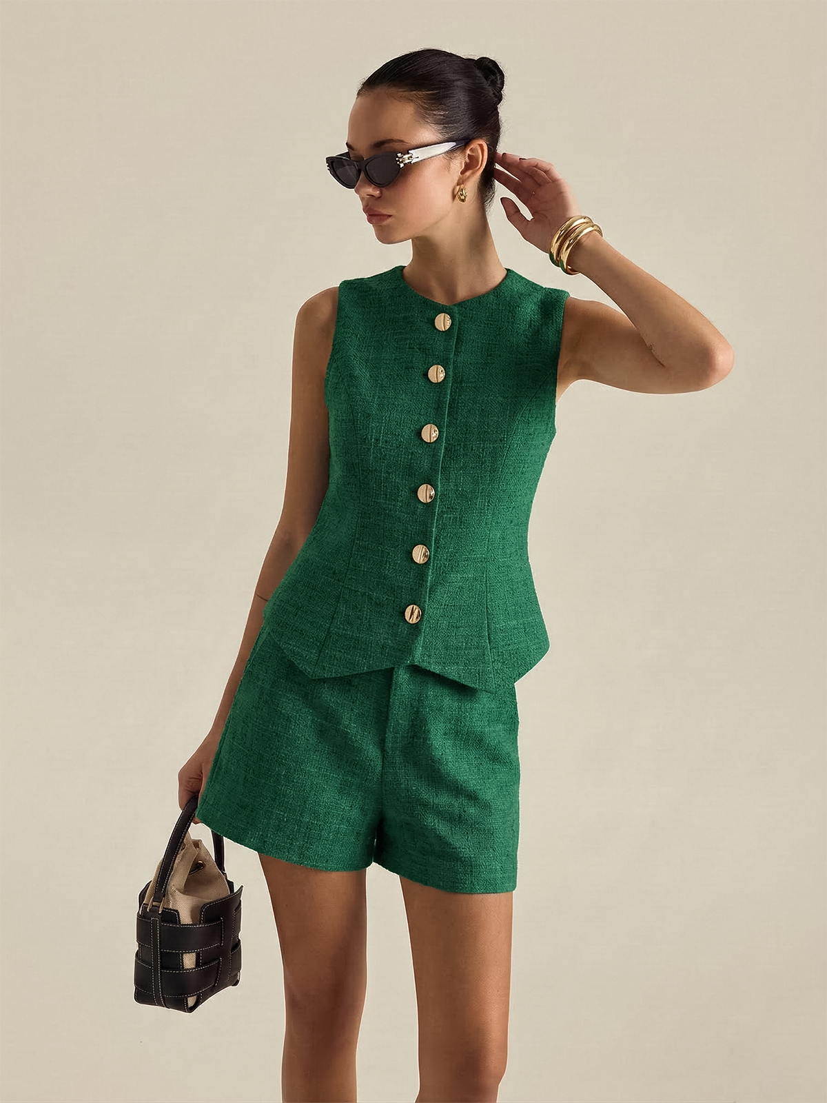 apricot,black,casual,cathryn-d,cici select,clothing,coll:matching_sets,coll:shorts,coll:vests,corpcore,cyy,elastic waistband,green,hm selected,in_six_month,metal detail,minegence,mwt,mwt-ss,non-stretch,not_low_sales,oa260108010,photo_ai,regular,regular fit,serena-选品,sets,short sets,women,woven fabric